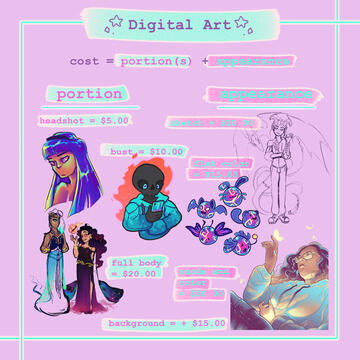 For additional characters / background, add it up as another portion (ex. a colored and shaded headshot + a sketched background = (20+5) + (10+15) = $50.00