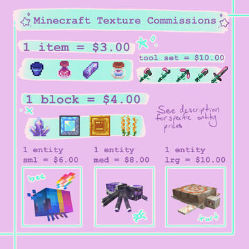 If you want to commission me, click the COMMISSION button to contact me. When requesting a commission that includes things from multiple sections (ex. a skin and a custom texture and etc), write "custom" as the commission type.